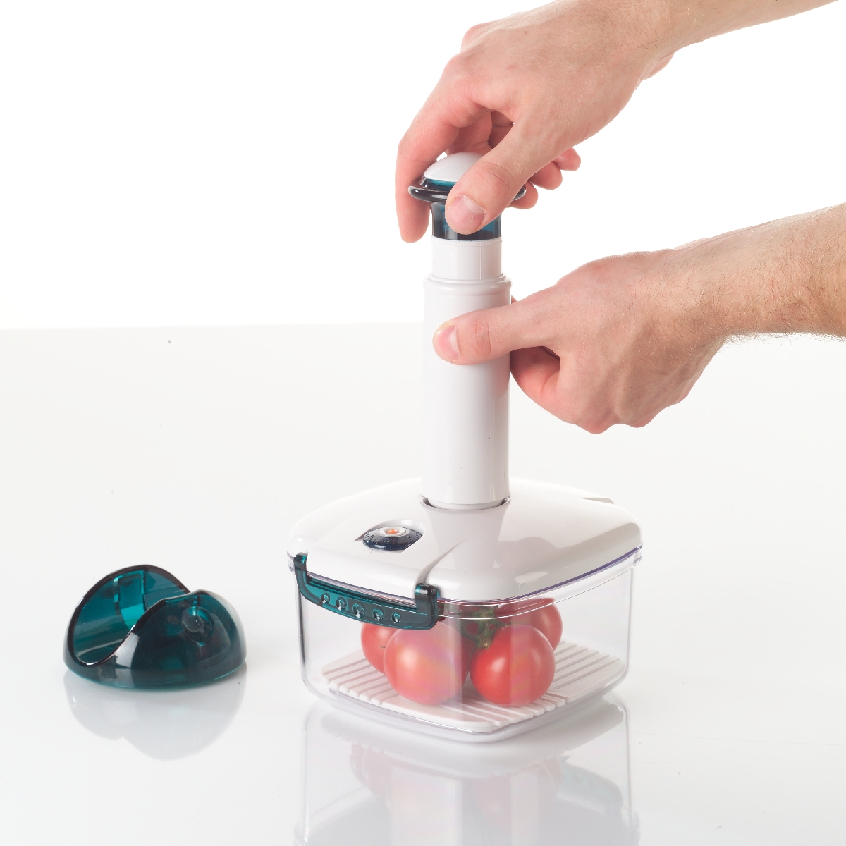 čtvercová vakuová nádoba o objemu 1200 ml, určená pro uchovávání potravin citlivých na tlak a tekutinu. Nádoba a víko jsou vyrobeny z odolného materiálu vhodného pro skladování v chladničce.