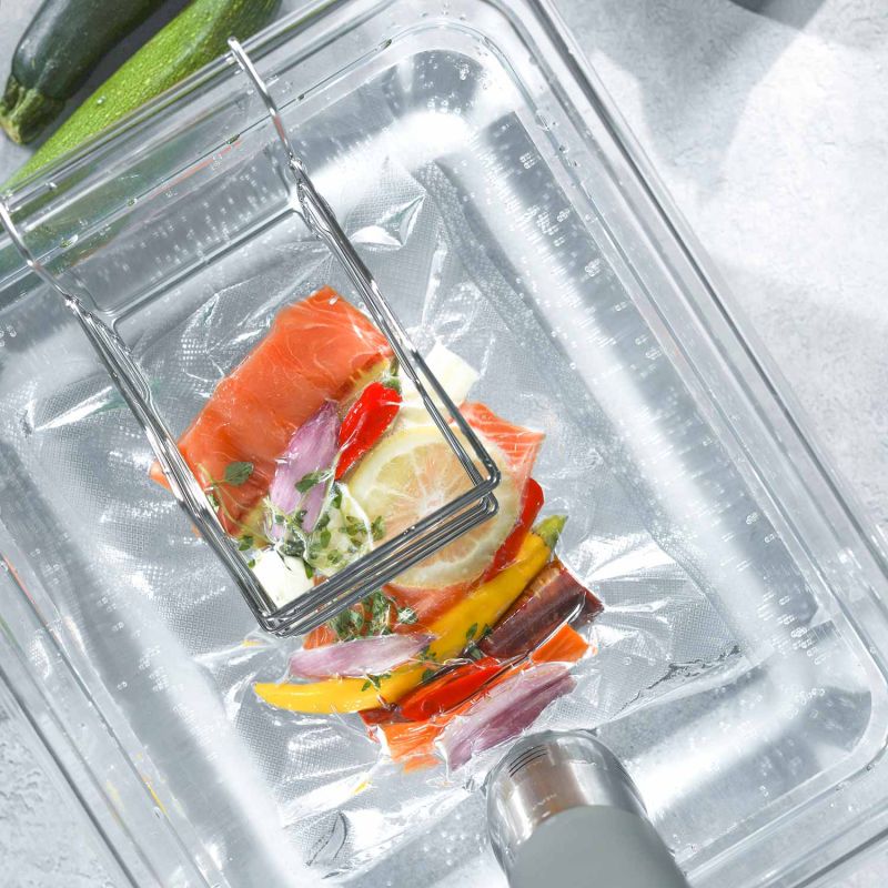 Pro ještě větší úsporu energie je součástí sady kvalitní neoprenový izolační obal, který chrání nádobu před tepelnými ztrátami. Praktický držák na sáčky z nerezové oceli lze snadno upevnit na okraj dřezu a pojme až pět varných sáčků. Díky tomu můžete připravovat více pokrmů současně a stále dosáhnete perfektních výsledků.