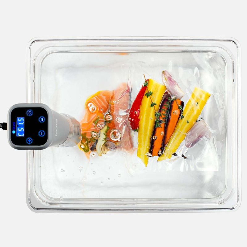 Průhledná plastová nádoba o objemu 12 litrů poskytuje dostatek prostoru pro přípravu pokrmů i pro více hostů. Víko s na míru vyrobeným otvorem pro sous vide tyč výrazně pomáhá udržet teplotu v nádobě a omezuje odpařování vody i při delších procesech vaření.