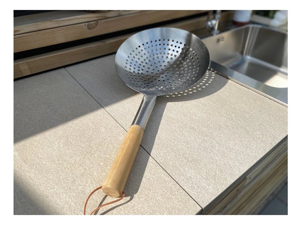 Rukojeť síta je vyrobena z bambusu, který je přírodní a ekologický materiál. Bambusová rukojeť je také velmi lehká a pohodlná k držení, takže můžete snadno pohybovat sítem po vaší kuchyni. Síto je také vybaveno koženou poutkem na zavěšení, který vám umožňuje snadno uchovat síto v kuchyni nebo na zahradě.